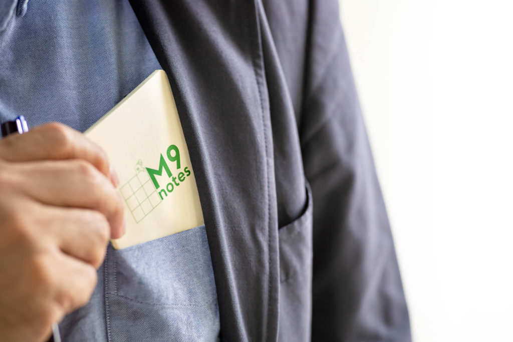 歩いているときにアイデアが浮かぶことを知っている人は、考えに行き詰まったときや、新しい発想がほしいときに散歩する、自分の散歩コースを持っています。そのコースには、ひとりになれる喫茶店があったりもします。京都の哲学の道や、学校のまわりにこうした小道が多いのも、先人たちの智恵なのかもしれません。そして、アイデアの逃げ足はとても速い。だから私は、いつも胸ポケットに青いペンとM9notesのポケットサイズを入れています。